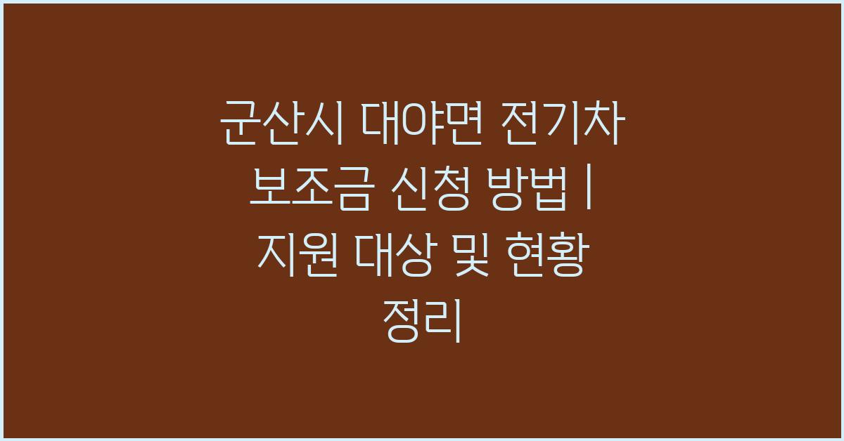A: 군산시 대야면의 전기차 보조금 신청은 온라인 또는 관할 관청에서 가능합니다. 주의할 점은 마감일이니 미리 준비해 두시는 게 좋습니다!